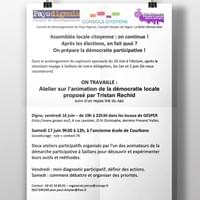 Nous préparerons à distance la construction de votre Assemblée Locale pour en vivre le premier acte grand public lors de notre passage. L'atelier de formation consistera à vous préparer à l'animation de cette première réunion publique consultative ouverte à l'ensemble des habitants de votre commune. Une formation d'une journée avant de vous lancer dans sa mise en pratique concrète le soir même.